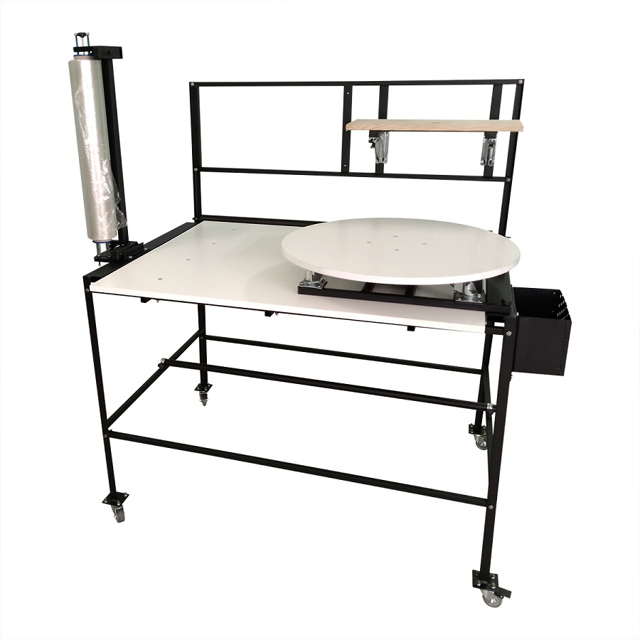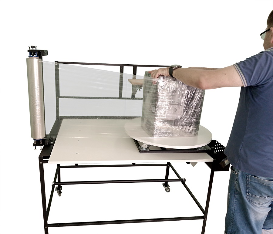 3) Equipped with holders for 1 roll of stretch film and 1 holder for bubble wrap or wrapping paper